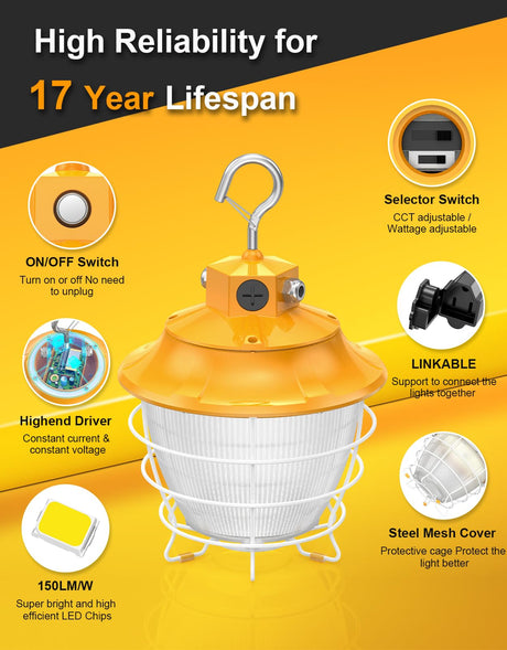 LED Temporary Work Light- PTL Series,100W,15000lumens,Selectable Wattage& CCT,AC120V,ON/Off Button