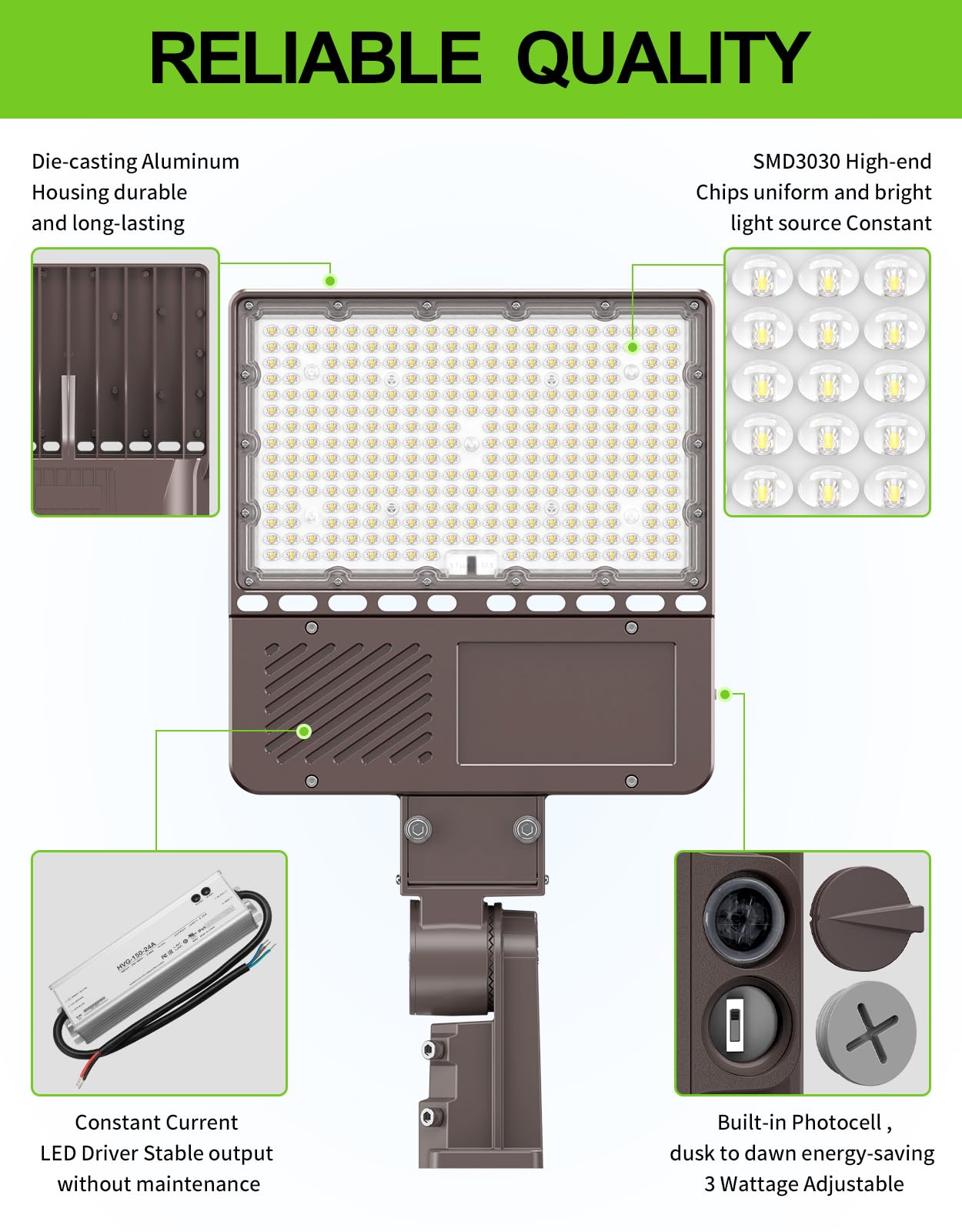 - Durable & Long Lifespan: LED commercial pole Shoebox light made of Industrial grade die-casting aluminum, SMD 3030 LED chips, brand driver, and Smart heat dissipation design, After tens of thousands of testing to ensure 50,000 hours of lifespan