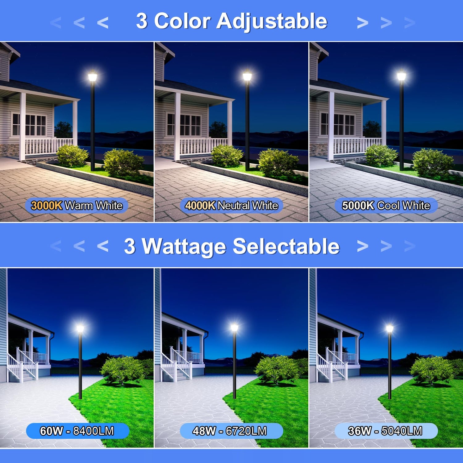 Choose from 60W (8400LM), 48W (6720LM), or 36W (5040LM) and easily adjust color temperature to 3000K Warm White, 4000K Neutral White, or 5000K Daylight. One light meets all your outdoor needs — perfect for yards, streets, gardens, parks, and pathways.