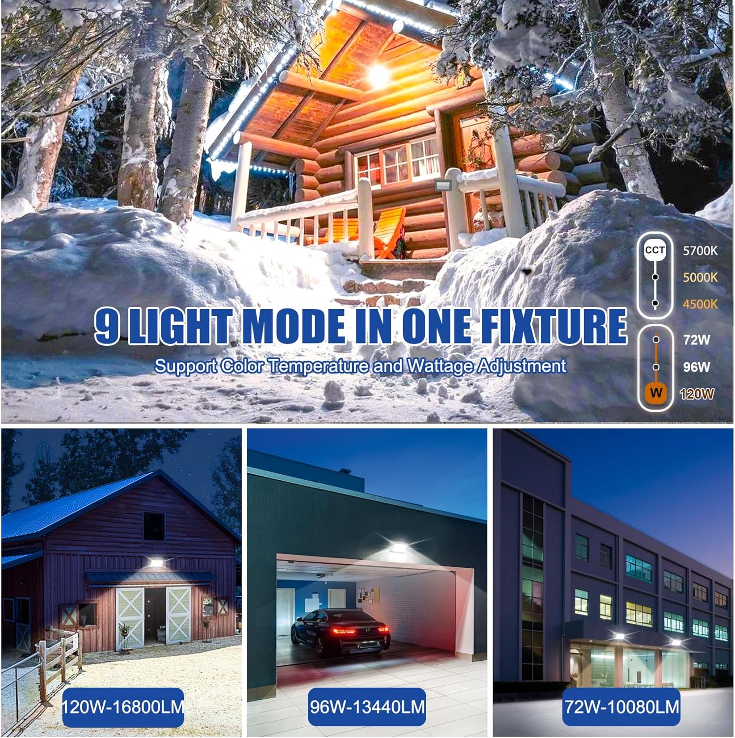Easily select from 120W / 96W / 72W output and 4500K / 5000K / 5700K color temperatures via built-in switches to suit various applications — from warehouse and factory to garage and workshop.